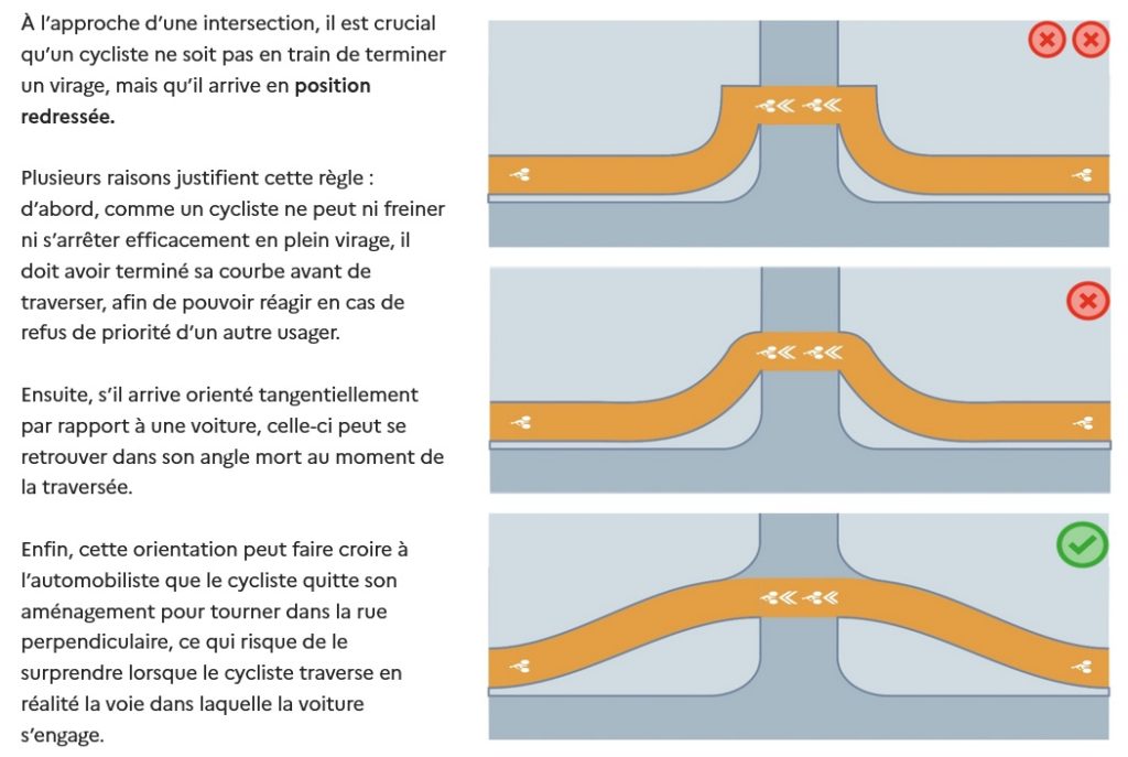 De plus, les trajectoires vélo ne sont pas crédibles. Proposer des trajets cyclables crédibles, respectant les règles sur les rayons de courbure des trajectoires, est la règle d’or selon les experts du Cerema.