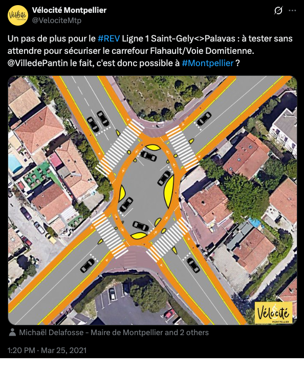Or, sur le carrefour Flahaut / Sabatier d’Espeyran, après les travaux, le rayon de courbure très élevé permet toujours aux véhicules de prendre le virage à droite à grande vitesse. Vélocité a préconisé la pose d’îlots-amandes avec des courbes resserrées, permettant une diminution de la vitesse des véhicules motorisés. Cette préconisation a été ignorée.