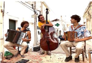 Vélo Swing c’est Iannis Ferrari (accordéon diatonique), Manu Ferrari (accordéon chromatique), Matteo Galli (contrebasse cyclopédique).